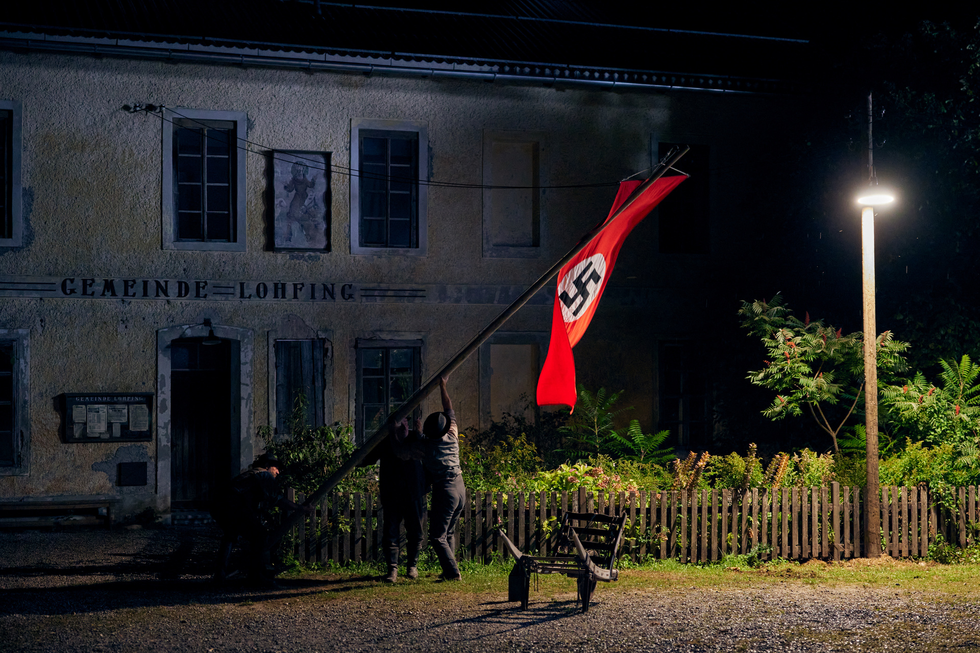 BU: In einer nächtlichen Aktion zersägt der alte Heingeiger (Sigi Zimmerschied) mit Unterstützung anderer Dorfbewohner den Fahnenmast und verbrennt die Hakenkreuzfahne (Copyright: ZDF/Fabio Eppensteiner)